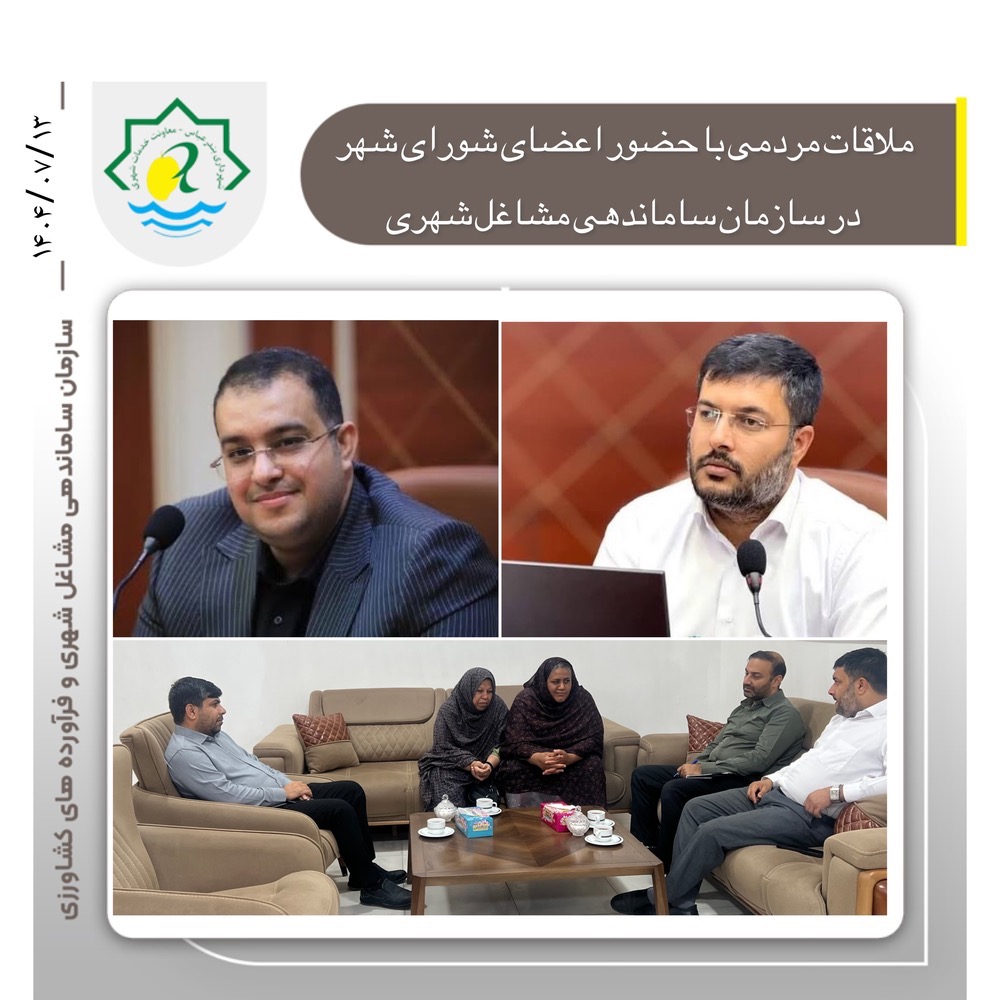 به گزارش روابط عمومی سازمان ساماندهی مشاغل شهری و فرآورده‌های کشاورزی، در تاریخ ۱۳ مهر ۱۴۰۴ جلسه ملاقات مردمی با حضور سیدرضا موسوی و مصیب نظری، از اعضای شورای اسلامی شهر، در محل سازمان برگزار شد.
